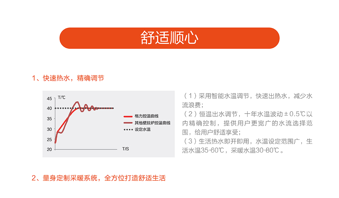 全預(yù)混燃燒結(jié)合雙寬域功率調(diào)節(jié),節(jié)能恒溫,溫差在±0.5℃之間,保證熱水四季恒溫快速出熱水,減少水流浪費(fèi),生活水溫度35-60℃,采暖水溫30-80℃