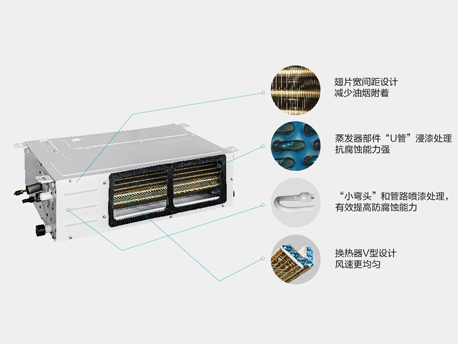 廚享內(nèi)機(jī)采用金色防腐翅片換熱器,抗腐蝕能力強(qiáng),翅片采用寬間距設(shè)計,可減少油煙附著:換熱器采用V型設(shè)計,使風(fēng)速更均勻。